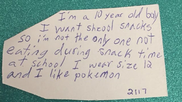 If that isn’t a gut punch, I don’t know what is. Having a snack at school might not even be about just hunger — it’s about not feeling ashamed and ostracized. It’s demoralizing for a child to have nothing to eat while everyone else around him does. A small snack seems like such a simple thing, but it carries a lot of meaning.