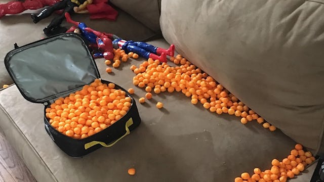 “We were watching TV, when I heard his little sister Alice wake up from her nap,” dad Andy Rine explains to Babble. “I went to get her out of her crib and while I was gone he went to the kitchen and grabbed a large container of cheese puffs his grandparents had given him in his Easter basket.” Okay. So the whole family knows how to party. We love them.