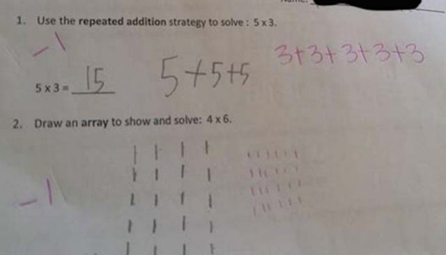Okay, first question: 5×3 does equal 15, so what the hell? My tiny, unCommon-Core trained brain looks at this equation and says, five, three times. Apparently my brain is supposed to be saying, five times three, you idiot. Three… five times. The problem is, as an idiot parent who hates math, I can’t logically figure out why it makes a fucking difference whether it’s five, three times or three, five times — because you will come up with the same answer, every time. What the hell, math?
