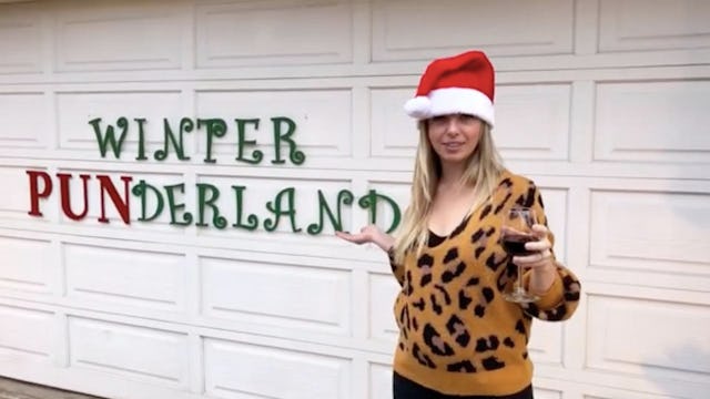 The duo shot a tour of their “Winter Punderland,” and shared it on Facebook, where it quickly racked up almost 20 million views. Kyle did the filming, and Cori conducted the tour — Santa hat on head, glass of red wine in hand (because, natch).