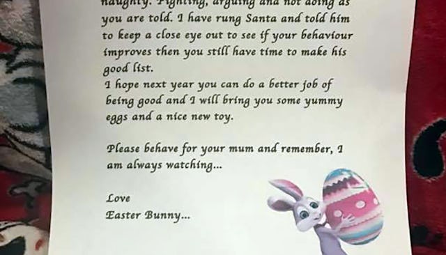 “I am writing you this letter to let you know that this year you are on my “Naughty List” and I am not bringing you any Easter eggs or gifts because I have been watching carefully and you have been very naughty,” the letter begins. “I have rung Santa and told him to keep a close eye out to see if your behavior improves then you still have time to make his good list.”