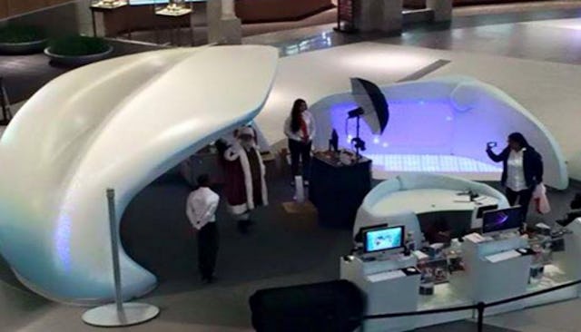 All this reminds me of is part of the set from a Lady Gaga concert I saw in 2014. I mean…what is it supposed to be? A futuristic snow pod of wonders? A Jetsons-themed Santa display? A UFO? It’s likely the worst Christmas display ever, and if it was conceived as an answer to making everyone at the Roosevelt Mall feel comfortable, I would say it’s an utter failure. I’m not a believer necessarily, but I do think Christmas trees have their place in a CHRISTMAS display where Santa photos are happening. Why in the world did they change it to such an extreme degree?
