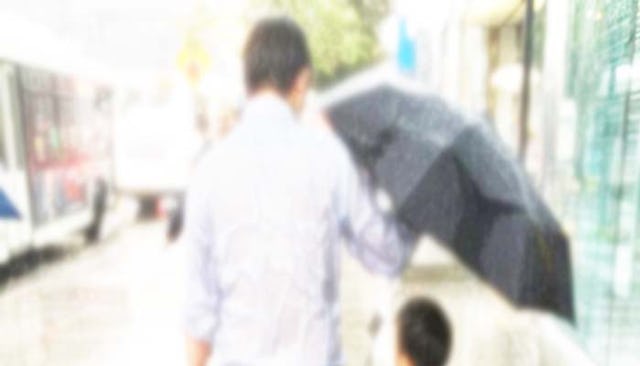 The pair is walking through downpour, and dad’s shirt is completely soaked while his son stays safely dry under the umbrella. Is this the perfect visual metaphor for parenting or what?
