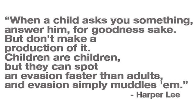 “When a child asks you something, answer him, for goodness sake. But don’t make a production of it. Children are children, but they can spot an evasion faster than adults, and evasion simply muddles ’em.”