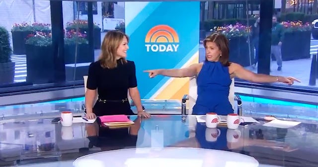 Guthrie in particular seemed to take the “no more social distancing” decree as a personal challenge, hopping into Kotb’s lap at one point and slinging her arm across Al Roker’s shoulder in another. Roker laughs it off, but tell me his smile in the clip below doesn’t look just a teeny little bit like he’s in a hostage video.