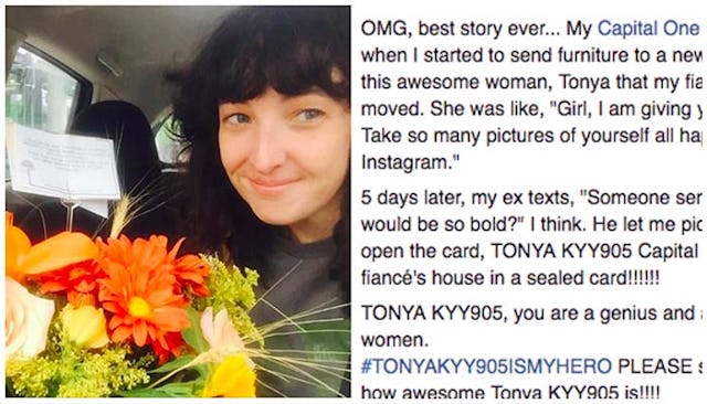 “I called and explained to this awesome woman, Tonya that my fiancé had broken up with me and I’d moved,” Grady explains. She was having a bunch of furniture sent to her new apartment, in a completely different neighborhood, which probably set off some alarms for her credit card company. So she had to call and explain all the events in her life that got her to that point, and ended up meeting Tonya on the other end of the line — a sympathetic ear. “She was like, ‘Girl, I am giving you 4,500 free miles. Go on vacation. Take so many pictures of yourself all happy and post them all over that Instagram.'” In case you’re wondering, 4500 miles isn’t anything crazy, it probably works out to $45 — so it’s not like Tonya was doing anything wrong by offering the miles. Just being an awesome woman. But the story gets better.