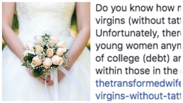 Do you know how much more attractive debt-free virgins (without tattoos) are to young men? According to a viral blog post, this is the ideal candidate for snagging a man on the hunt for a spouse. And no, this isn’t a post from The Onion we’re talking about here, this is a real woman who wrote real words about why women shouldn’t be educated or mark their skin with the Devil’s ink.
