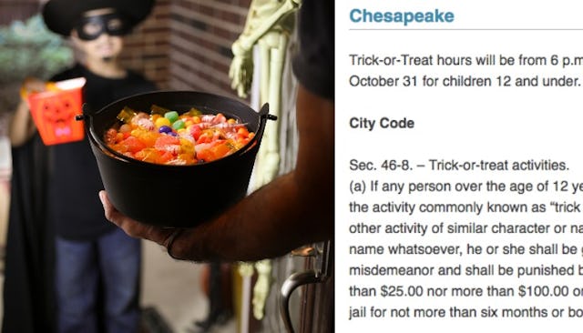 “If any person over the age of 12 years shall engage in the activity commonly known as ‘trick or treat’ or any other activity of similar character or nature under any name whatsoever, he or she shall be guilty of a misdemeanor and shall be punished by a fine of not less than $25.00 nor more than $100.00 or by confinement in jail for not more than six months or both,” it reads.