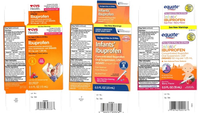 The recalled products sold at Walmart had expiration dates of February 2019, April 2019, and August 2019. The ones sold at CVS and Family Dollar expire in August 2019 and were packaged in 0.5 oz. bottles labeled “Infants’ Ibuprofen Concentrated Oral Suspension,” used as a pain reliever and fever reducer.
