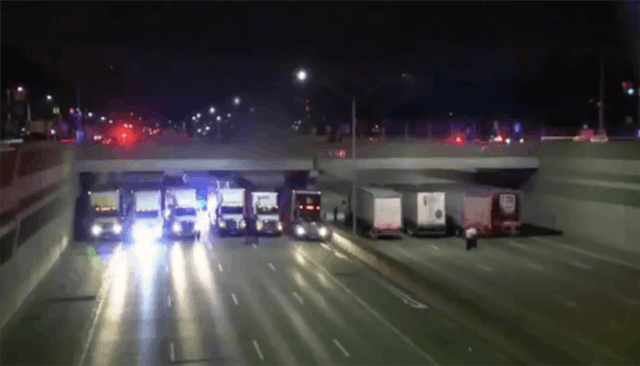 As more semi trucks showed up, the westbound lanes also closed until there were enough trucks to span the length of the overpass. 13 trucks in all parked close together to provide a shortened fall if the man jumped from the bridge up above.