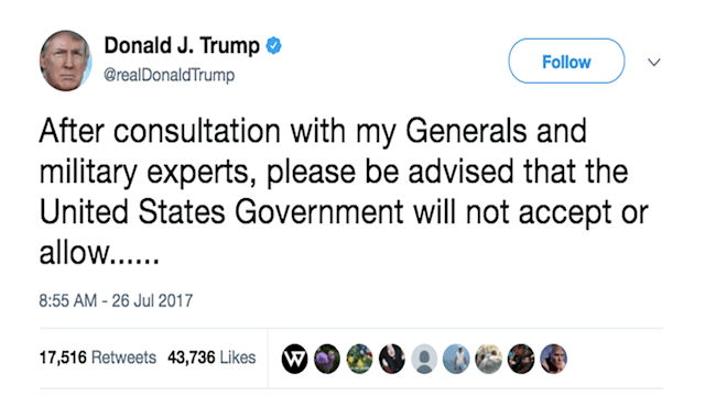 “After consultation with my Generals and military experts, please be advised that the United States Government will not accept or allow transgender individuals to serve in any capacity in the U.S. Military,” Trump writes. “Our military must be focused on decisive and overwhelming victory and cannot be burdened with the tremendous medical costs and disruption that transgender in the military would entail. Thank you.”