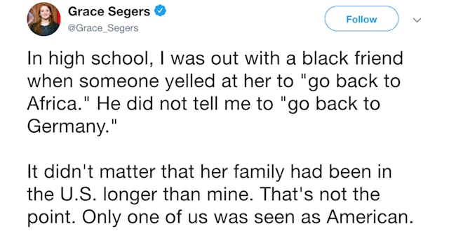 Let’s revisit that last line of that last tweet: “It didn’t matter that her family has been in the U.S. longer than mine. That’s not the point. Only one of us was seen as American.”