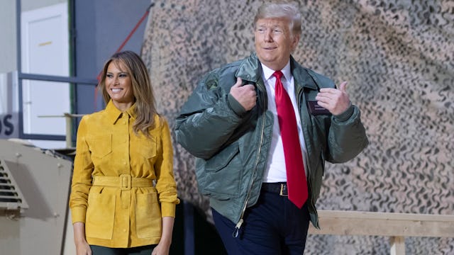 TOPSHOT – US President Donald Trump and First Lady Melania Trump greet members of the US military during an unannounced trip to Al Asad Air Base in Iraq on December 26, 2018. – President Donald Trump arrived in Iraq on his first visit to US troops deployed in a war zone since his election two years ago (Photo by SAUL LOEB / AFP) (Photo credit should read SAUL LOEB/AFP/Getty Images)