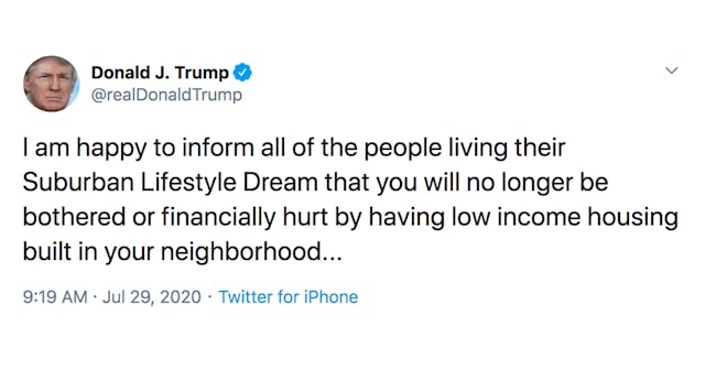 “I am happy to inform all of the people living their Suburban Lifestyle Dream that you will no longer be bothered or financially hurt by having low income housing built in your neighborhood,” Trump tweeted.