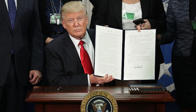 In a feeble attempt to avoid coming off like the bigot that he is, Trump didn’t mention Islam or Muslims during the signing ceremony, but he did say that this policy was part of the new “extreme vetting process” to protect the U.S. from “radical Islamist terrorists.”