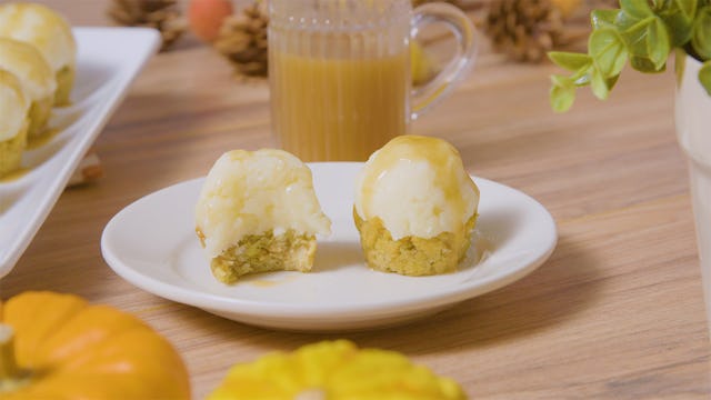 2. Grease mini muffin tin 3. Spoon stuffing into each mini muffin, packing it down and filling it slightly above the top 4. Bake in the oven for 18-20 minutes, until edges are browned 5. Remove from oven and let sit until cool enough to handle 6. Using a tablespoon scoop, scoop out the mashed potatoes and form into a ball 7. Place on top of each stuffing filled muffin tin and top with gravy