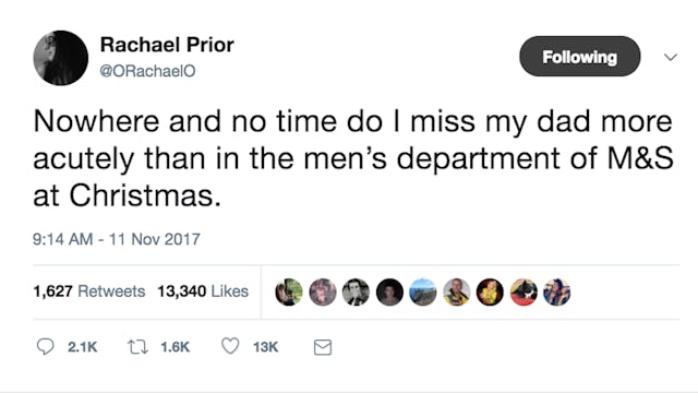 Prior says she had no idea her tweet would spread so far and be felt so deeply. “It felt cathartic to use Twitter but I didn’t think for one minute my innocuous tweet would catch on. It’s been bizarre.” Her raw sadness obviously struck a chord and made thousands feel less alone in their grief this holiday season.