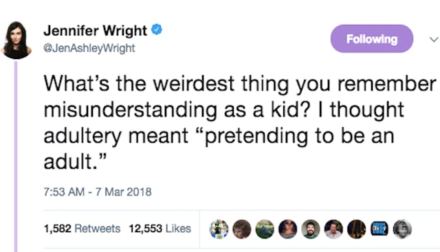 Author Jennifer Wright was reminiscing about her own childhood and some of the things that confused her as a child asked her followers if she was the only one. “What’s the weirdest thing you remember misunderstanding as a kid? I thought adultery meant ‘pretending to be an adult,'” she wrote on Twitter.