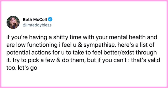 “If you’re having a shitty time with your mental health and your low functioning i feel you,” McColl wrote. “[H]ere’s a list of potential actions for [yo]u to take to feel better/exist.”