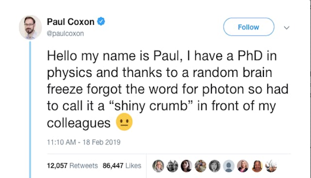 “Hello my name is Paul, I have a PhD in physics and thanks to a random brain freeze forgot the word for photon so had to call it a “shiny crumb” in front of my colleagues,” he wrote. Oh, Paul, we’ve all been there and we are so happy someone with your education also has brainfarts from time to time.