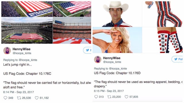 Twitter user HennyWise decided to point out what a ridiculous argument this is in a brilliant thread last week. In it, he breaks down the U.S. Flag Code, to illustrate that people who conveniently have a problem with “disrespecting” the flag right now, actually have no leg to stand on.
