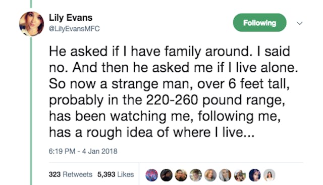 Lily Evans took to Twitter recently to describe a scary encounter with a strange man while she was out walking her dog. Her first tweet reads, “Why some women are ‘rude’ or ‘cold’ or ‘standoffish’ to men in public: a thread.”