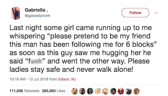 The online conversation started when Gabriella Rich took to Twitter to share a recent experience she had with a female stranger. “Last night some girl came running up to me whispering ‘please pretend to be my friend this man has been following me for 6 blocks,'” Rich tweeted. “As soon as this guy saw me hugging her he said ‘fuck’ and went the other way.”