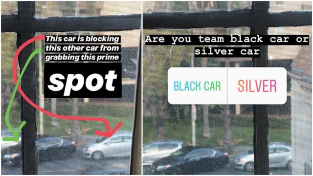 The black car in question appears to have attempted to park in a spot before being completely blocked by the silver car that drove up right behind it, determined to also mark its territory. The battle begins at 6:30 p.m. and was documented with perfect humor by Twitter user @Mrhflrs.