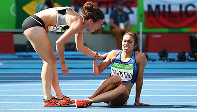 Yesterday, we got to see a show of sportsmanship unlike any other in the women’s 5,000-meter final at the Rio Olympics. Runners Abbey D’Agostino of the United States and Nikki Hamblin of New Zealand had about 2,000 meters left to go (or, about one mile out of an approximately three-mile race) when Hamblin fell, taking D’Agostino, who was right behind her, down with her.