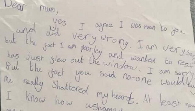 “Dear Mum,” the note begins. “Yes, I agree I was mean to you and did very wrong. I am very sorry, but the fact that I am poorley and wanted to rest has just flew out the window [sic]. I am sorry, but the fact that you said no one would buy me really shattered my heart. At least now I know how ashamed you are of me. All my love, Ellie.”