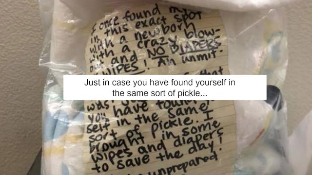 This mom didn’t shame another mom for being unprepared, but instead shared a little story about her own experience, and paid it forward by leaving a little care package to help a mom who finds herself in the same situation.