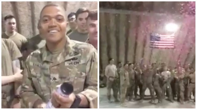 “So, my boy Harris, you know we’re going to do it for him,” the soldier orchestrating the reveal says. “We’re going to see what kind of baby he’s going to have. I don’t know if it’s a boy or a girl, a zebra or a unicorn, but we’re going to find out.”