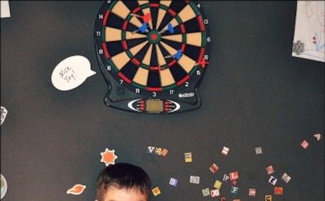 Unfortunately, it was more like seven cans of paint and my sanity. The box claims it will take three coats, but that’s bullshit — nothing stuck on that wall after three coats. Six coats later, magnets finally do stick to the wall and it is pretty cool, but OMG, the process almost killed me.