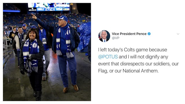 You have such a powerful platform, Mr. Pence. You could inspire real change in our country if you wanted to. Not theoretical, feel-good pride for this nation, but actual change. What if, instead of leaving the stadium yesterday, you had relaxed, enjoyed some football with your wife, and then tweeted your gratitude for our freedom of speech and your commitment to making America great for everyone, regardless of the color of their skin? I’m not sure if all that would fit in 140 characters, but think of what an impact it would have made.