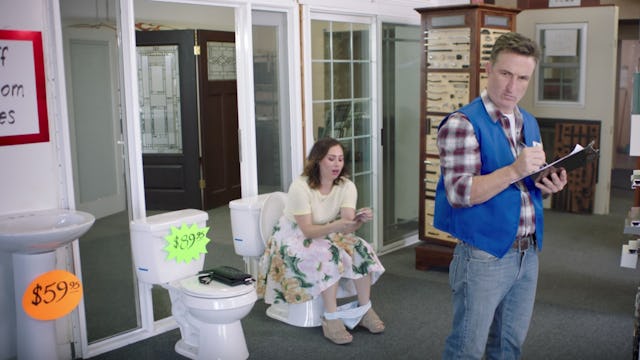One video shows a man working in a hardware store next to a display of toilets. A woman who clearly has some business to take care of scurries over and looks *ahem* relieved as she sits on the toilet while the man’s back is turned. When he notices her popping a squat and scrolling on her phone behind him, he’s rightfully horrified, and when he asks her what she’s doing, she starts ranting about “biological urges” and how he is flaunting everything he has out in the open. She finally storms off, but not before yelling at him about getting his “signals straight.”