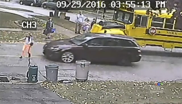 CTV News Toronto has more footage from a nearby security camera that shows the whole incident. The young girl got off the bus, but was talking to some friends so she missed crossing with the bulk of the kids who had gotten off. The driver pulled back the stop sign, but when Rebecca moved to cross, waved her along anyway. At that moment, a car sped around the bus and nearly hit Rebecca.