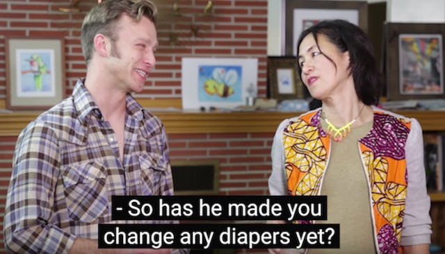 The video opens with a dad asking a mom if she’s been forced to change any diapers yet (ha!), and then goes through a handful of different scenarios where we fling an unfair amount of responsibility on moms or treat dads like second class citizens.