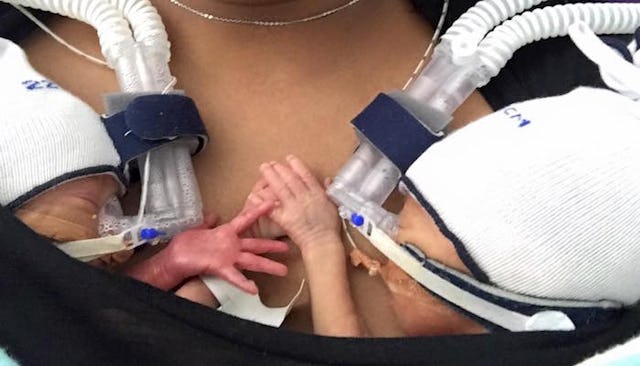Anthea “Cookie” Jackson-Rushford gave birth to her twins, Kristian Ian and Kristiana Micaela, 11 weeks before her expected due date. Born at only 28 weeks gestation, each weighed about two pounds, but their small size and early entry into the world didn’t stop them from fighting to stay together. Soon after their birth, their parents began posting videos of them holding hands at every possible opportunity. First while doing skin-to-skin time on their dad’s chest: