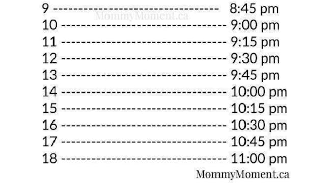 The chart starts at age two, probably because expecting a regular bedtime from a child younger than that is so laughably ridiculous as to not even go there. It then makes bedtime 15 minutes later for each year until the magical adult age of 18.