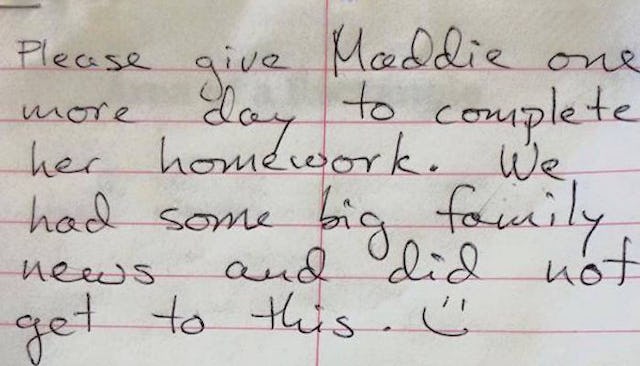 Recently, Reddit user phomb shared a note they called the “best homework excuse ever.” It was written for a little girl named Maddie and said she didn’t get her homework done the previous night because her family was busy celebrating some really big news. When I first saw it, I assumed the news would be a pregnancy or engagement or something equally relatable, but I was wrong. Turns out Maddie’s grandfather won a Nobel Prize!