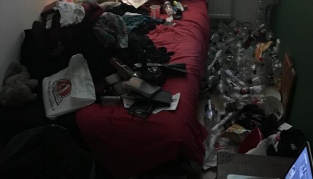 The user uploaded a picture of their messy room. The floor barely visible, empty plastic bottles strewn all over the place, loose papers and a bed completely covered with stuff. They wrote, “I suffer from severe depression and have a really hard time with cleaning and doing other kinds of household work.” They continued, “My room [has] been this messy for several months because I can’t push myself to take care of it. But this Friday I decided to finally do it!”