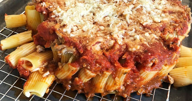 My back still hurts from all the work this pasta cake took. Standing rigatoni up trying to get it all erect and shit looks easy on a TikTok video but I lost my patience very quickly. I felt like I was playing dominos. A few times one of them fell over and they all fell over. Some of the pieces of pasta were flat and I had to force them open to stuff the cheese inside.