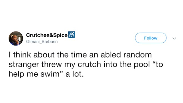 It all started with @Imani_Barbarin’s tweet. “I think about the time an abled random stranger threw my crutch into the pool ‘to help me swim’ a lot,” she wrote, and tacked on #ablesareweird.
