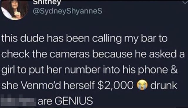 Instead of inputting her phone number, the woman wired herself $2,000 from the guy’s account via Venmo. GOOD LORD what a great idea. Honestly, this is the only thing that has made me envious of single people who are dating in the age of Extreme Technology. (I’m not condoning robbery, I’m just saying if this is true it’s enviable, evil genius work.)