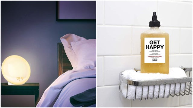 This wake up light stimulates sunrise and will gradually brighten the room to help you leisurely get up. It also doubles as an alarm clock and an FM radio. Bonus points: you can also use it as a sleep aid, complete with soothing sounds to lull you into some serious slumber.