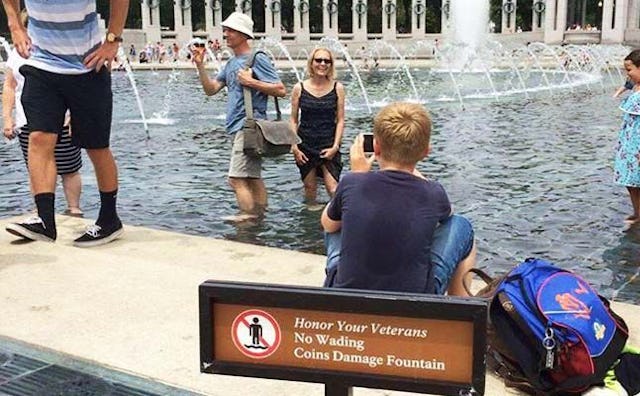 “The fountain at the WW II memorial is not the slip and slide at Busch Gardens. I apologize to the Greatest Generation, I’m afraid it’s my generation that’s raising self-involved, entitled children with low SAT scores – who mistakenly believe bucking authority is funny. Hey parents, get out of the water – set an example and #raiseYOURkids SHARE if you agree.”
