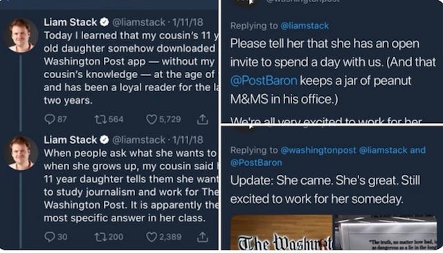 “Today I learned that my cousin’s 11-year-old daughter somehow downloaded The Washington Post app — without my cousin’s knowledge — at the age of 9 and has been a loyal reader for the last two years.”