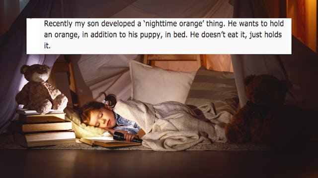 Redditor fishsocks posted about their son’s oddball habit of taking a specific piece of fruit to bed with him. They write, “Recently my son developed a ‘nighttime orange’ thing. He wants to hold an orange, in addition to his puppy, in bed. He doesn’t eat it, just holds it.”