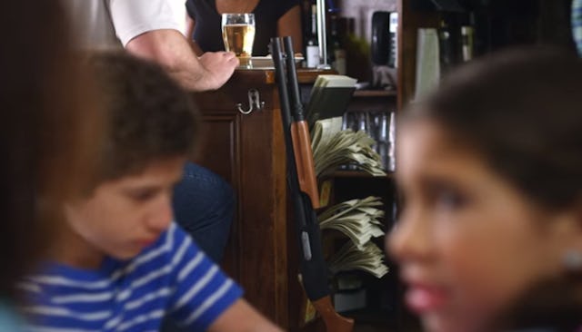 When they arrive at the restaurant, the family is joking about what to order for dinner when suddenly, the tone changes. Things grow quiet as the daughter notices a gun propped up against the bar and asks her mom if everything’s ok. The camera then pans around the restaurant where we see several other guns leaning against the walls, presumably next to the people who carried them in. It ends with Dratch looking at the camera mouthing exactly what someone watching this video is probably thinking — what the fuck?