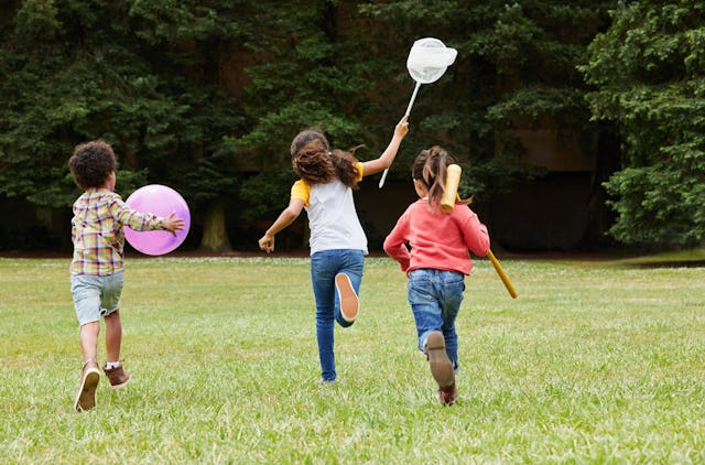 One of the primary benefits of outside play is that outdoor spaces act as a kind of blank slate where kids can concoct the most imaginative scenarios. Without screens or toys, a puddle becomes a giant lake. A leaf morphs into a spaceship. A tree turns into a … well, whatever a tree could turn into. (See? Kids are the ones with the pure, uncut imagination!)